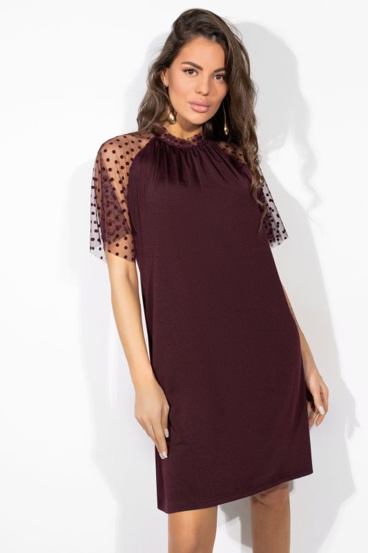 Платье бордовое с прозрачными рукавами из сетки