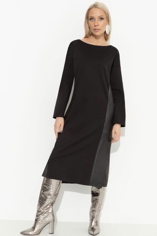 Платье чёрное с вставками из экокожи от компании Charutti. Модель прямого силуэта, выполнена из трикотажного полотна "джерси". Круглый вырез горловины. Длинные рукава. Есть карманы. Низ ровный, в боковых швах разрезы. Отличный вариант для насыщенного событиями дня деловой леди.