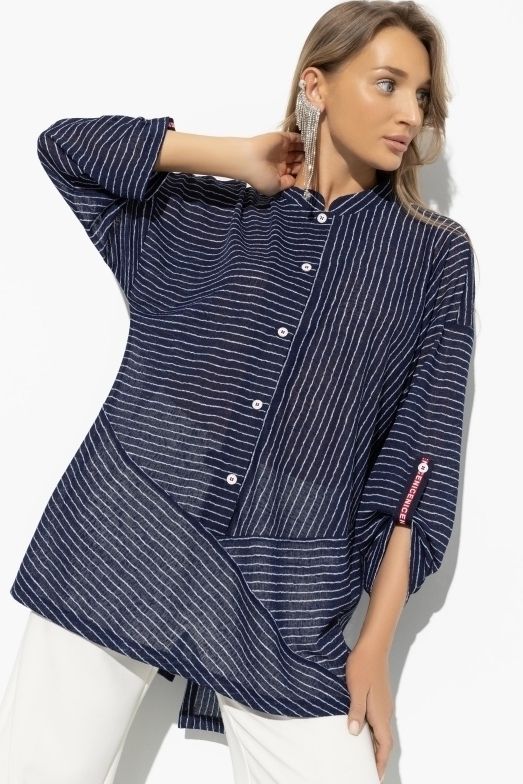 Трикотажная синяя блузка с асимметричным низом от компании Charutti. Модель свободного силуэта, выполнена из ткани "дорис". Воротник-стойка, переходящий в планку с застёжкой на петли и пуговицы. Длинные втачные рукава с патой. Низ с разрезами. Идеальный выбор для Вашего стильного гардероба.