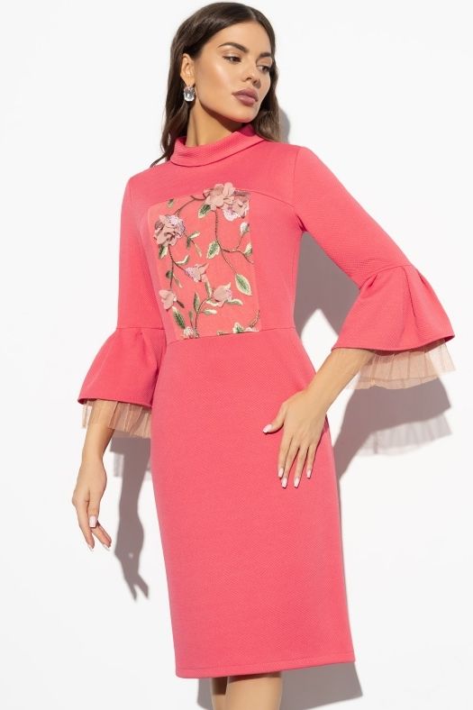 Трикотажное розовое платье с отделкой из сетки плессе и кружа с вышивкой