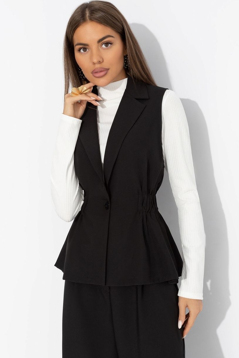 Жилет чёрный приталенный на резинке от компании Charutti, выполнен из костюмного полотна. Модель с лацканами, застегивается на пуговицу. Прекрасное решение для создания стильного образа.