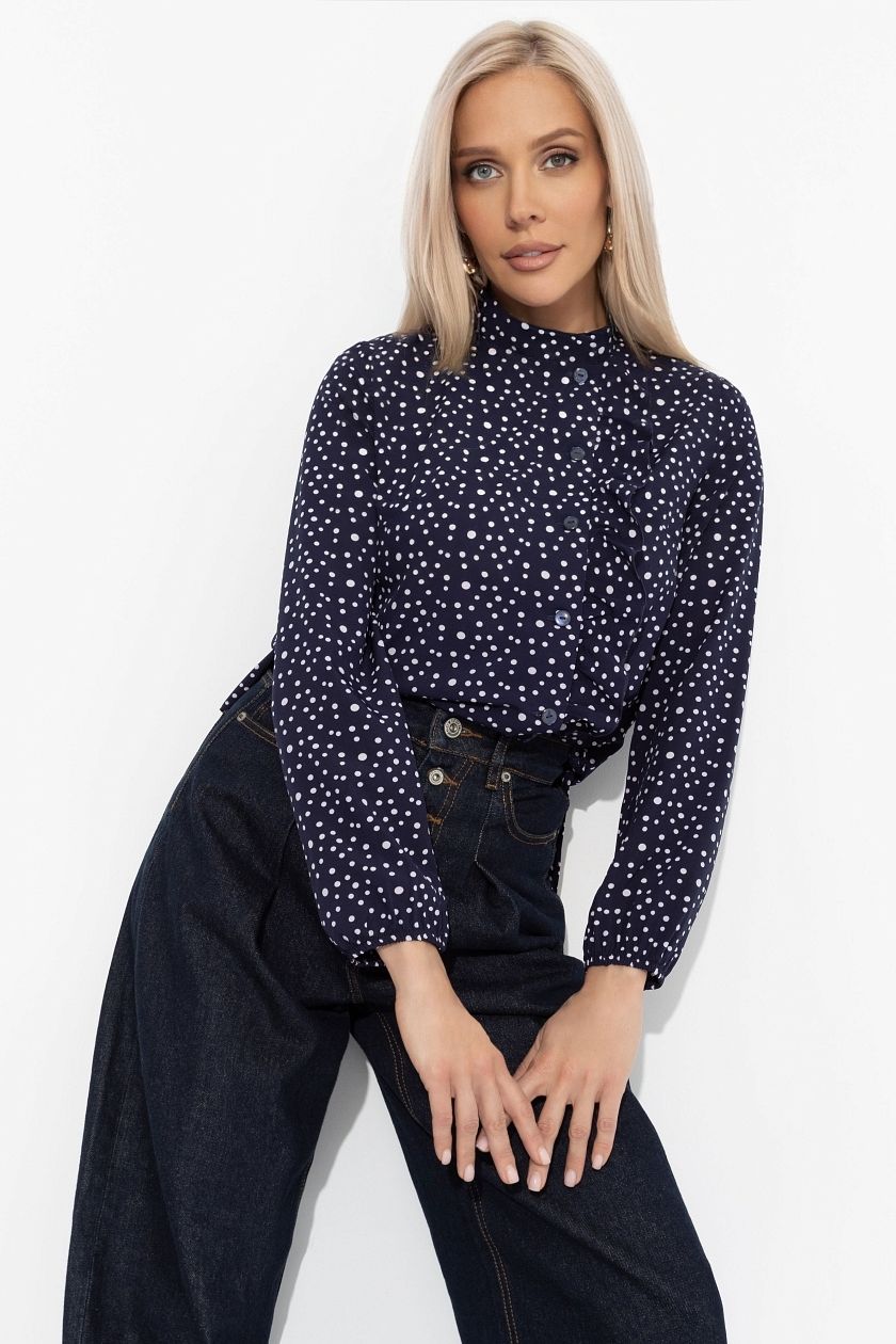Блузка тёмно-синяя в горошек с воланом