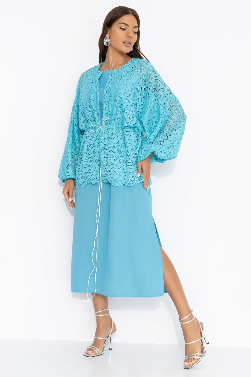 Костюм-двойка бирюзовый с кардиганом из кружева от компании Charutti. Платье-комбинация прямого силуэта в длине миди, выполнено из платьельного полотна. Хорошо смотрится на любом типе фигуры. Есть деликатный разрез. Кардиган на кулиске из кружевной ткани, слегка просвечивает. Свободные рукава обрамлены тонкой резинкой на запястье. Отличный выбор для создания романтичного образа.