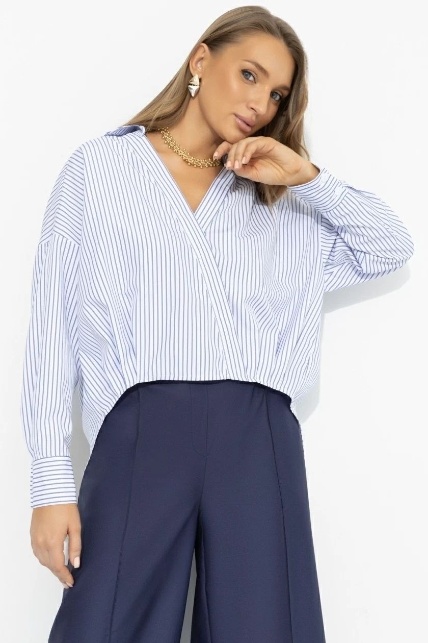 Джемпер лёгкий сиреневого цвета с удлинённой спинкой в полоску