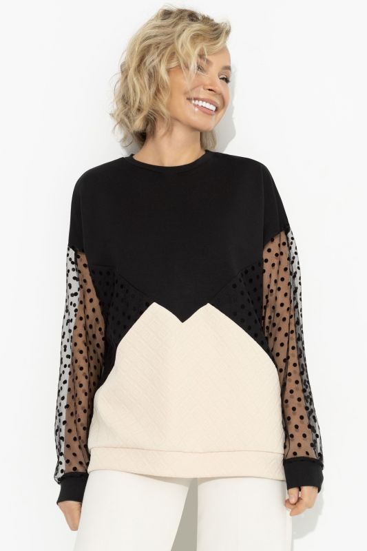 Свитшот дизайнерский с рукавами из сетки от компании Charutti. Модель свободного силуэта, круглый вырез горловины. Длинные втачные рукава, со спущенной линией плеча. Низ изделия и рукавов на притачных манжетах. Прекрасное решение для создания стильного образа.