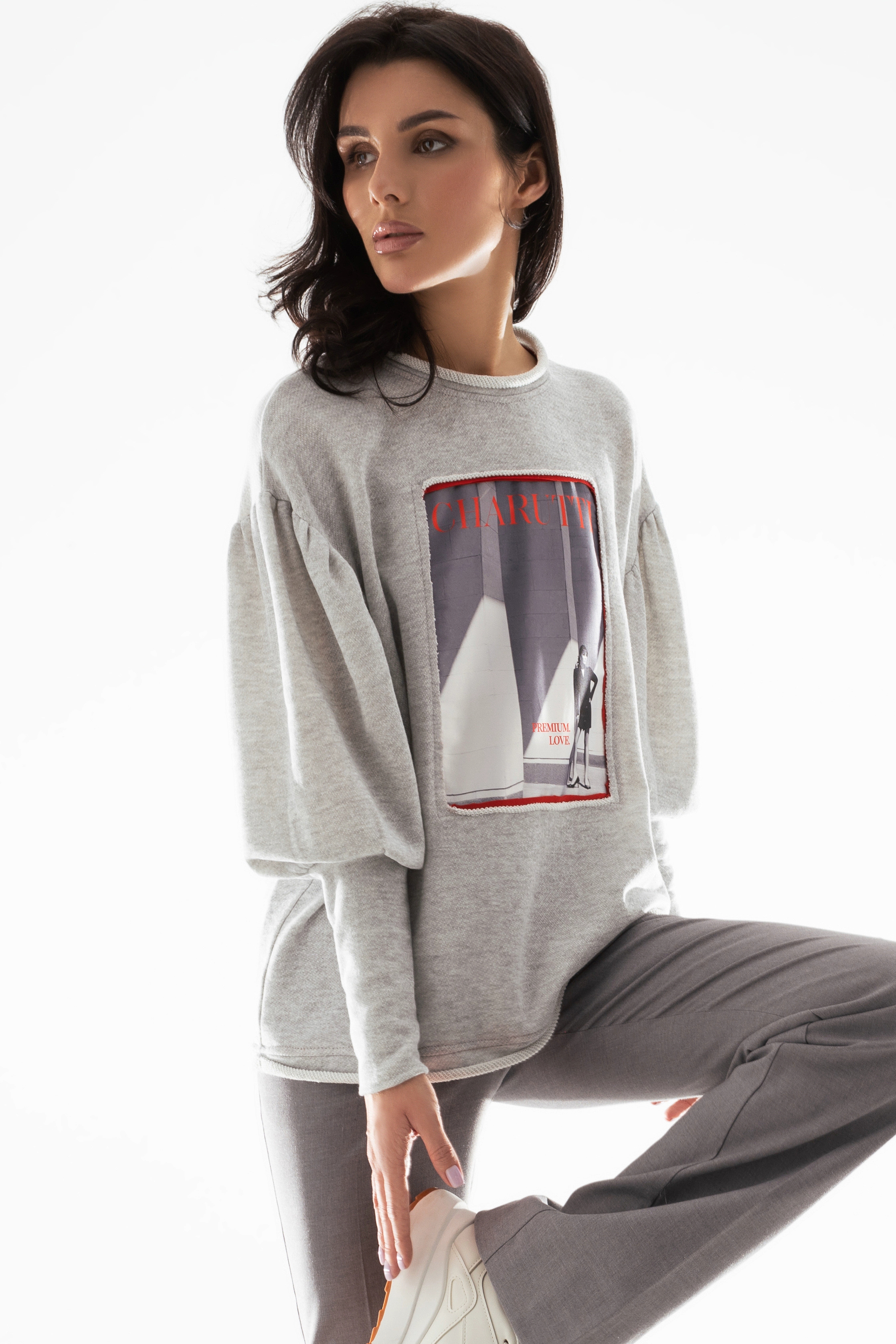 Свитшот из футера с объёмными рукавами от компании Charutti. Модель прямого силуэта, выполнена из трикотажа «двухнитка» и шёлка «бавария». Круглый вырез горловины. Втачные длинные рукава, со спущенной линией плеча, на широких манжетах. Идеальный выбор на каждый день.