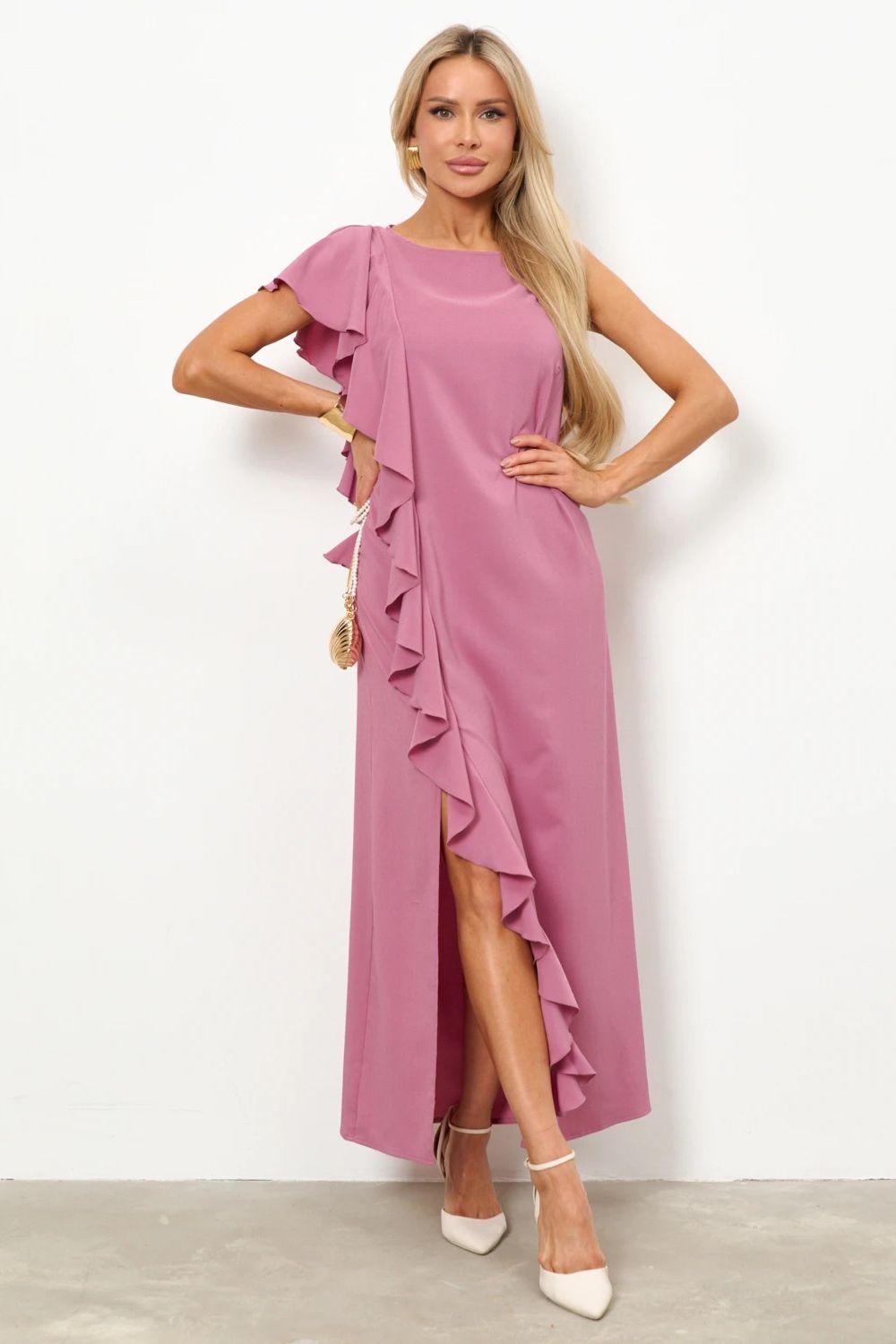 Платье длинное розовое с воланом