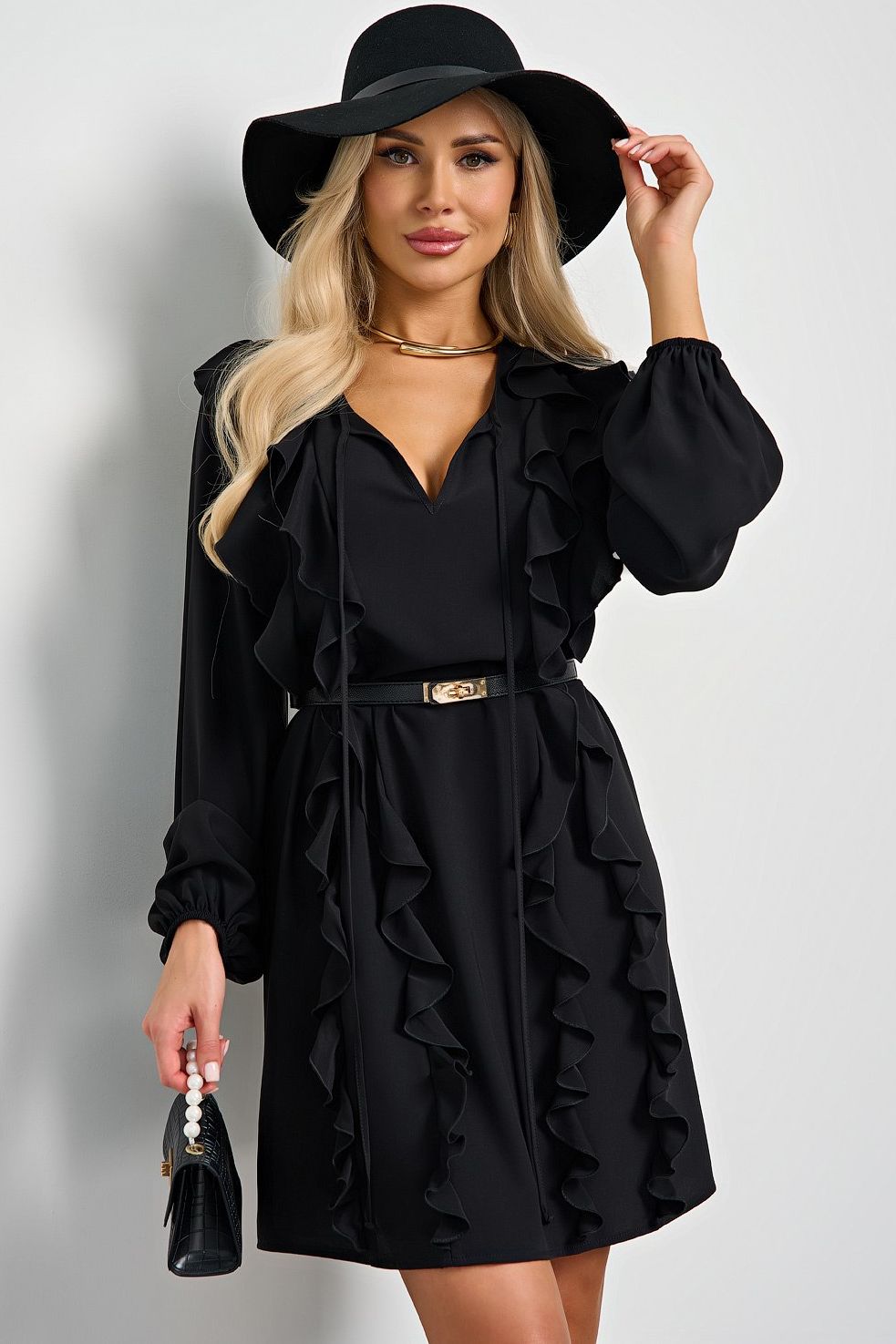 Платье чёрное с воланами от компании Jetty. Модель прямого кроя, выполнена из плательного полотна. Вырез по переду декорирован завязками. Рукав длинный на резинке.