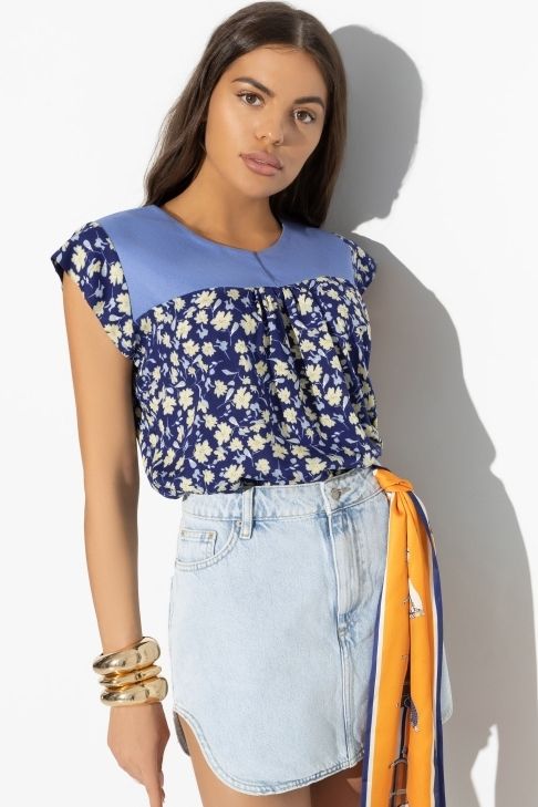 Туника летняя синего цвета с рукавами-крылышки от компании Charutti. Модель свободного силуэта, выполнена из штапельного полотна с цветочным принтом. Круглый вырез горловины. Кокетка - втачка из джинсы. Низ ровный, без разрезов. Идеальный выбор для городских модниц.