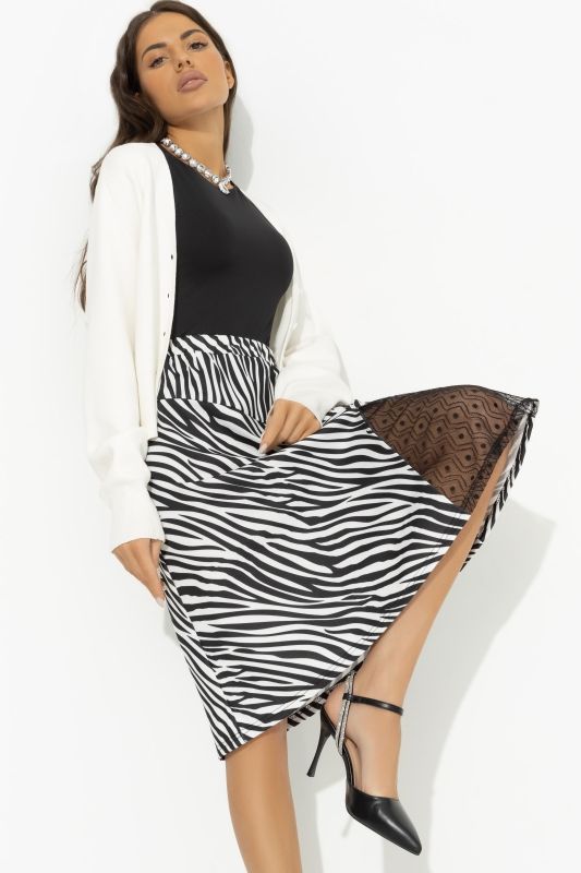 Юбка трикотажная с принтом зебра от компании Charutti. Модель расклешенного силуэта в длине до колена. Разрез оформлен тонким кружевом. Посадка изделия на талии. Пояс оформлен скрытой резинкой. Идеальный выбор для создания женственного образа.