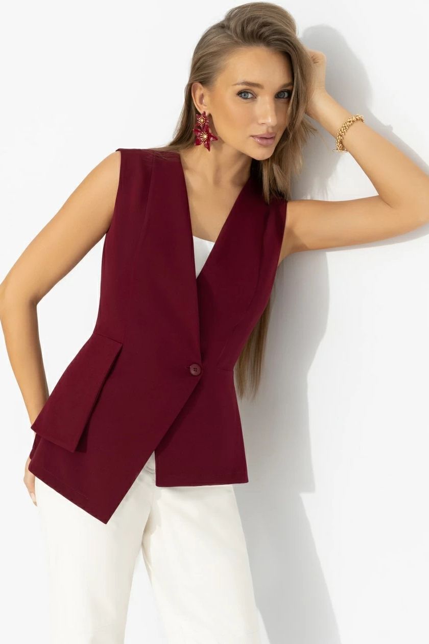 Жилет бордовый для уверенности на каждый день от компании Charutti. Модель приталенного силуэта, выполнена из костюмной ткани "гальяно". V-образный вырез горловины. Полочка фигурная с застёжка на одну пуговицу. С боку отлетная декоративная баска. Прекрасное решение для создания стильного образа.